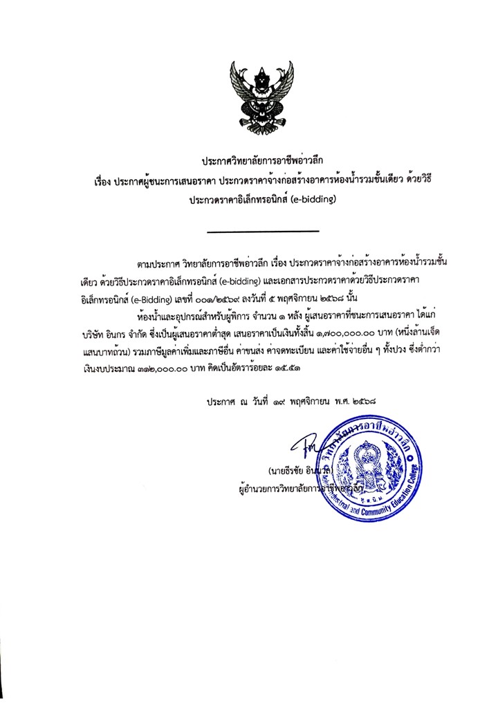 ประกาศ..เรื่องประกาศผู้ชนะการเสนอราคา ประกวดราคาจ้างก่อสร้างอาคารห้องน้ำรวมชั้นเดียวฯ