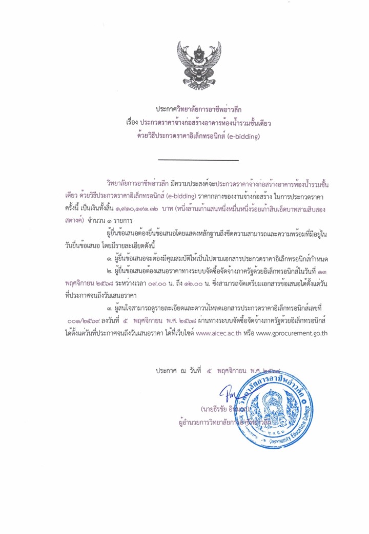 ประกาศ..เรื่องประกวดราคาจ้างก่อสร้างอาคารห้องน้ำรวมชั้นเดียวฯ
