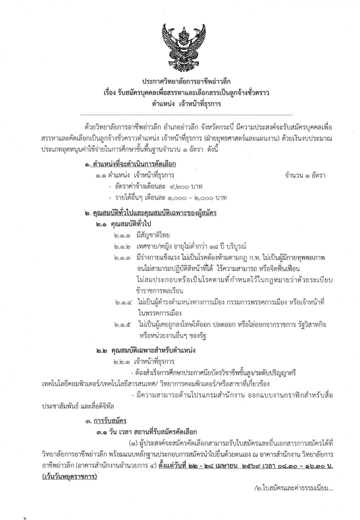ประกาศ...เรื่อง รับสมัครบุคคลเพื่อสรรหาและเลือกเป็นลูกจ้างชั่วคราว ตำแหน่ง เจ้าหน้าที่ธุรการ