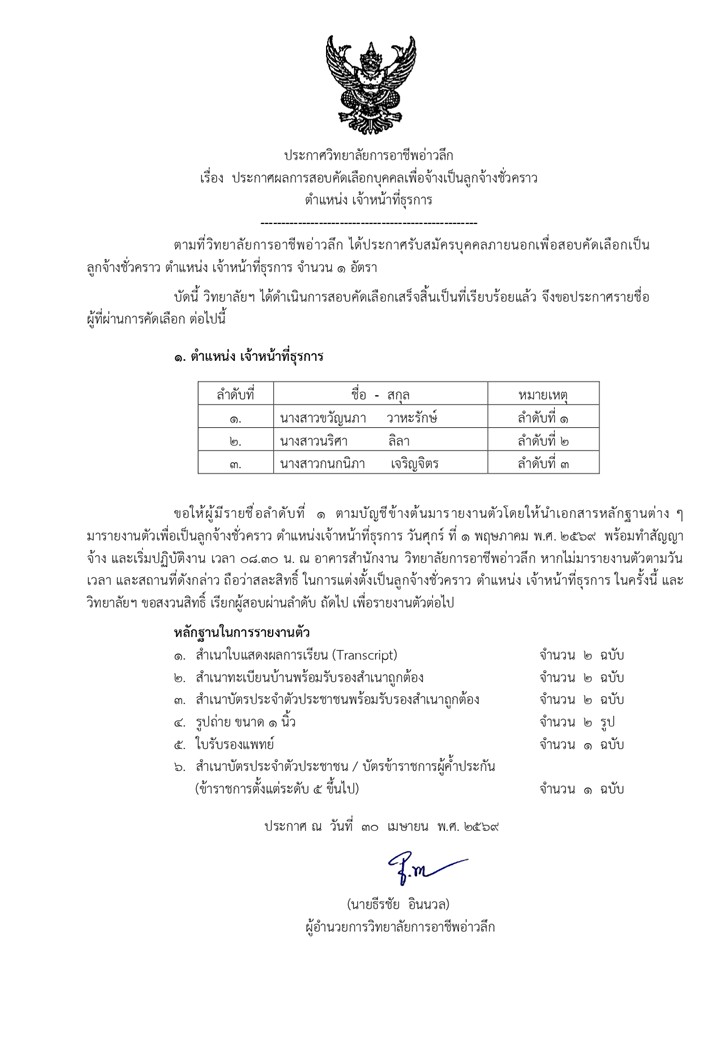 ประกาศ...ประกาศผลการสอบคัดเลือกบุคคลเพื่อจ้างเป็นลูกจ้างชั่วคราว ตำแหน่งเจ้าหน้าที่ธุรการ